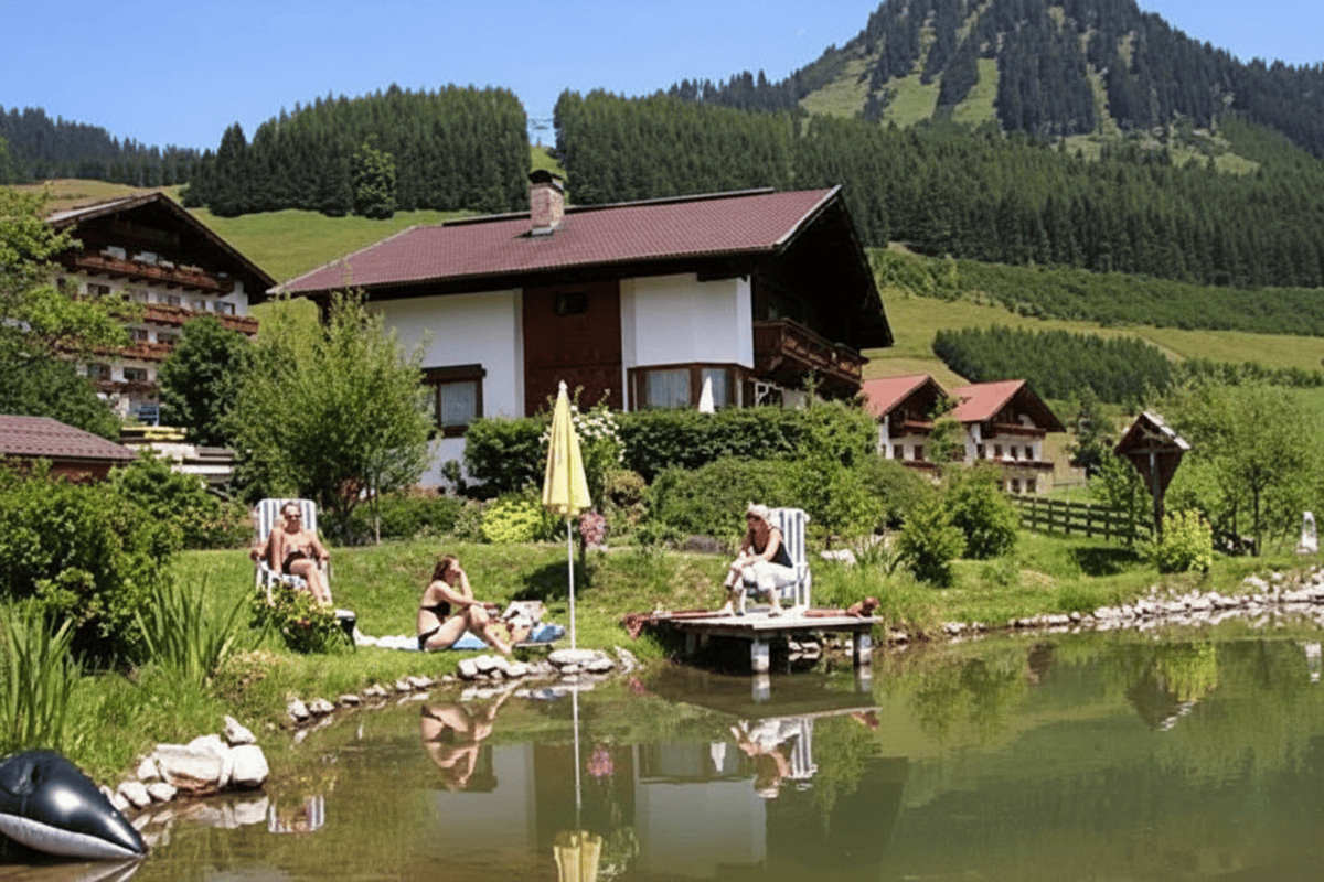 Das Ambiente zeichnet sich durch angenehme Großzügigkeit aus – seien es die mit Naturholz ausgestatteten Wohnräume, der besondere Blick auf das herrliche Bergpanorama oder im Sommer unserer eigenen Badeteich.
